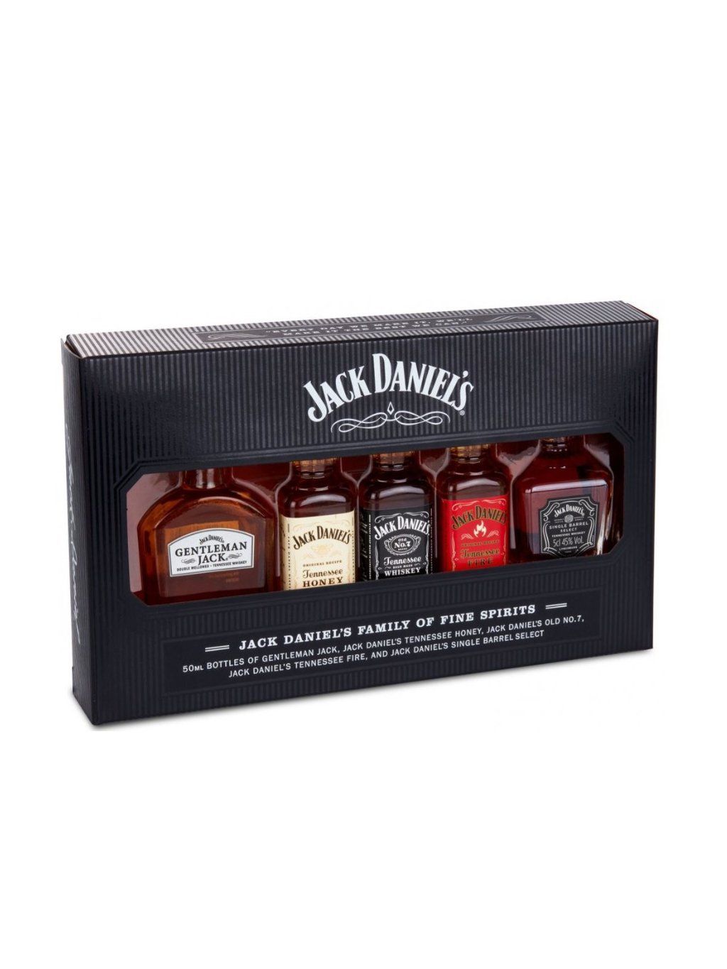 Krásné dárkové balení 5 druhů produktů značky Jack Daniel's. Najdete v něm degustační minilahvičky Jack Daniel's Honey, Jack Daniel's Fire, Jack Daniel's Single Barrel, Jack Daniel's Whisky a Jack Daniel's Gentlemam Jack.